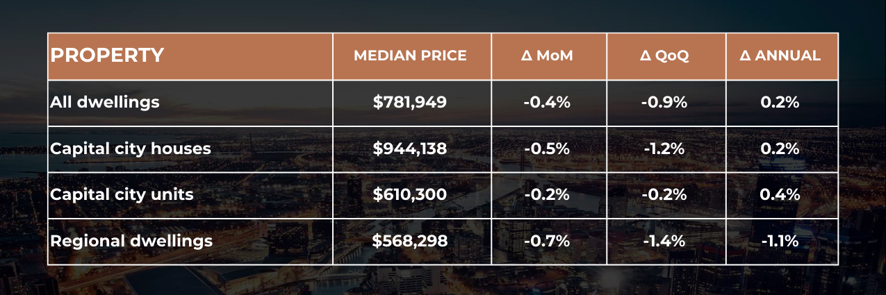 As of July 2024, dwelling values have declined by 0.9% over the last quarter, but on an annual basis, they have still seen a slight increase of just over 0.2%. (CoreLogic Home Value Index Report 2024)