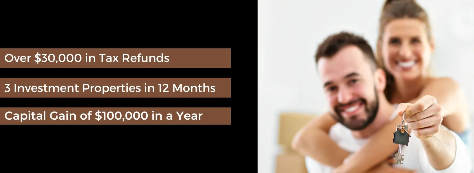 Do you know anyone who gets excited about filing their tax returns? Our clients do. Learn about a professional couple who received over $30,000 in tax refunds through a portfolio of 3 investment properties built seamlessly.